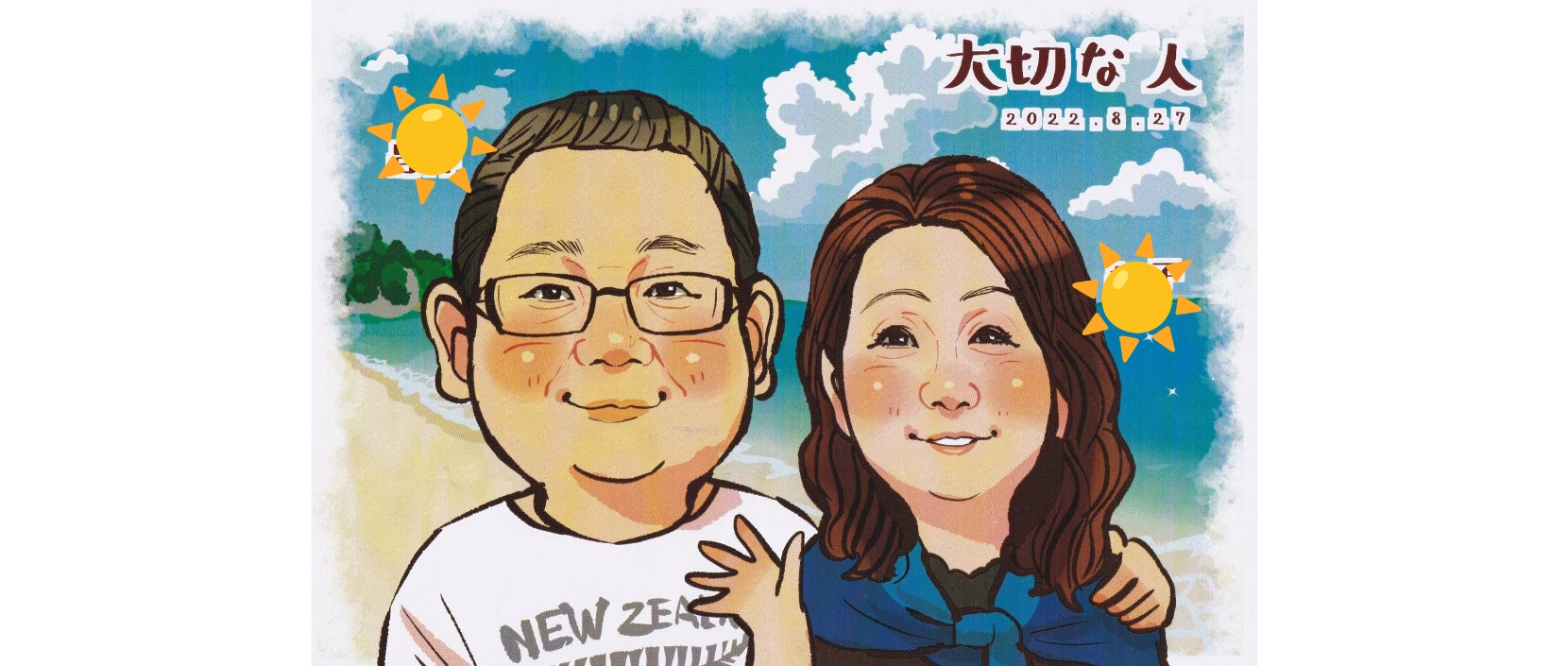 上月先生に『2人最上級の幸せそうな顔に描いて下さい』とお願いしたところ『心を込めて描かせて頂きます。』とのメールを頂きました。1週間足らずで作品が届きました。まず開封した私の目に両親の満面の笑みが飛び込んできて涙が止まりませんでした。早速母に届けたところ作品を観てその場に泣き崩れました。「お父ちゃんが笑ってる…お父ちゃんが笑ってる…」と繰り返しながら。「これでずっとお父ちゃんと一緒に居れる…」とも。たった数枚送らせてもらった写真でここまでリアルにそして温かい作品を本当にありがとうございました。母に最高のプレゼントが出来ました。