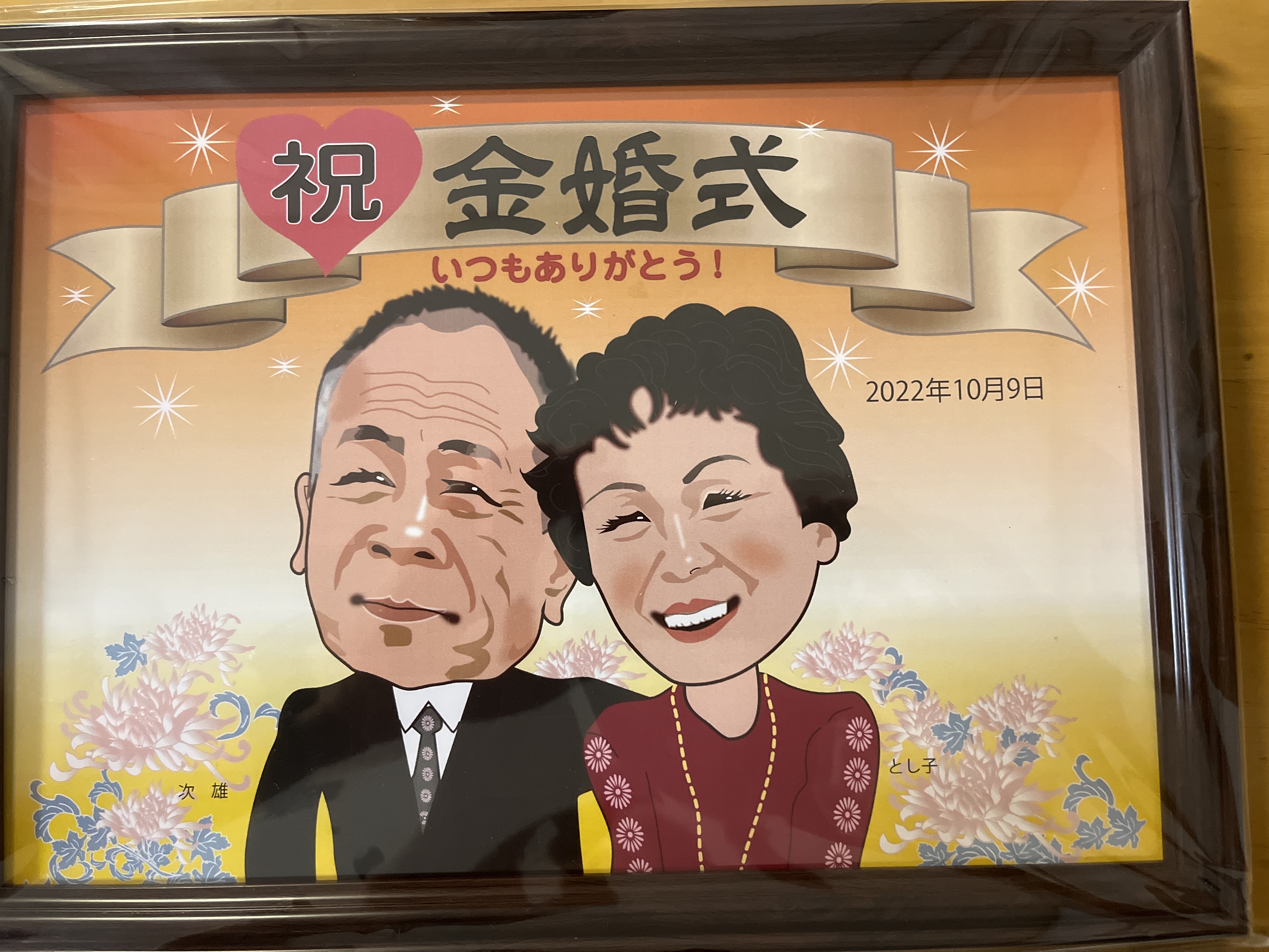 義理父母の金婚式のプレゼントに似顔絵をプレゼントします。当日サプライズで花束と書いていただいた似顔絵を渡す予定です。到着が間に合うかドキドキしましたが、この絵が届き箱を開けて思わず笑みがこぼれました。本当に似顔絵っていいですね また途中色々とご丁寧にご対応いただきありがとうございました。今度は私達の銀婚式の似顔絵をお願いしたいです。
