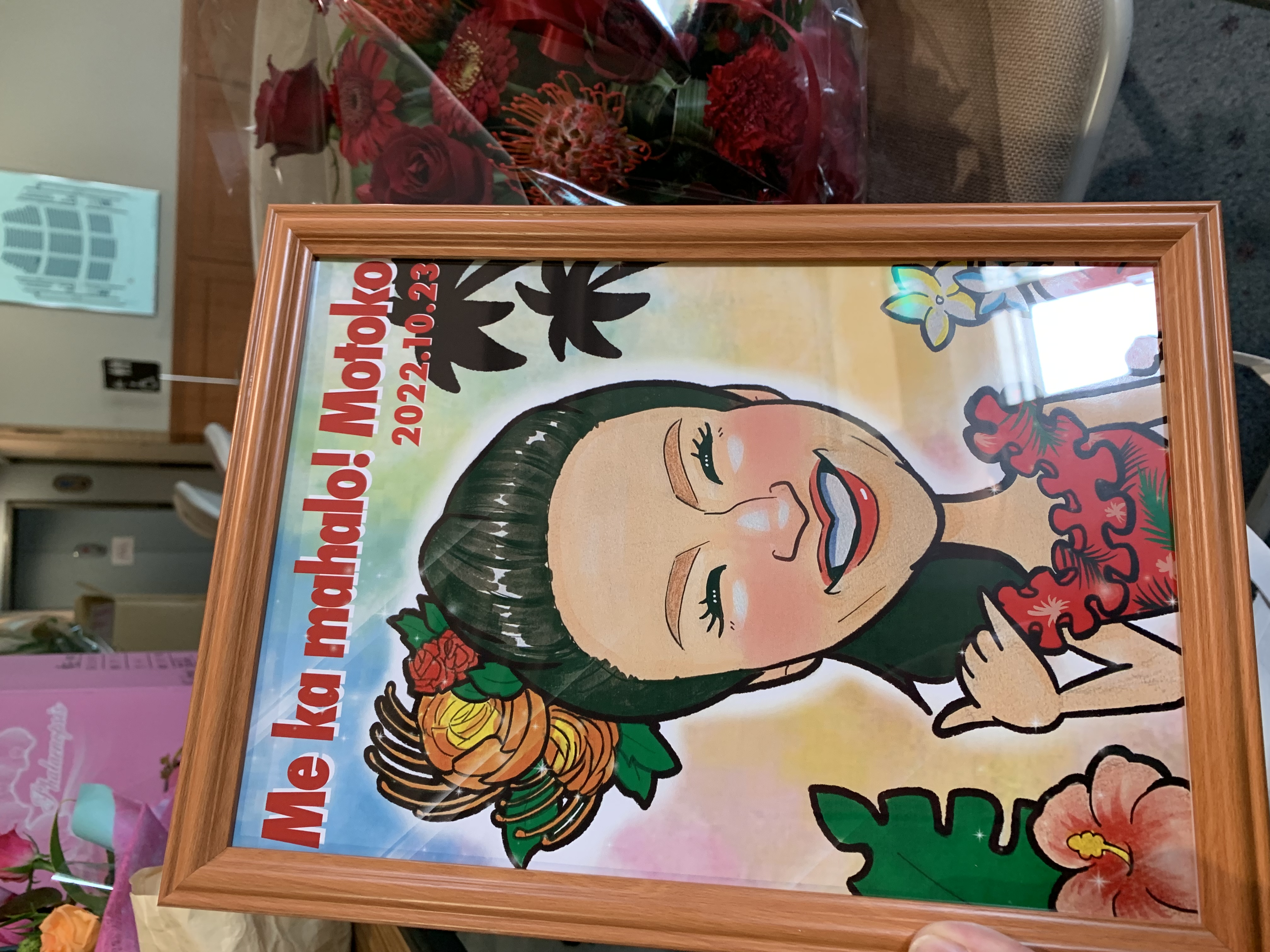 フラダンスの発表会で生徒から先生へプレゼントしました。 皆さん花の贈り物が多い中似顔絵を贈ると大変感動していつも以上からハートフルなフラダンスが踊れたと大喜びでした。 今回は参加できなかったメンバーからの気持ちを伝えることもできたので本当によかったです。 短納期にも関わらず素晴らしい似顔絵を書いてくださいありがとうございました♪
