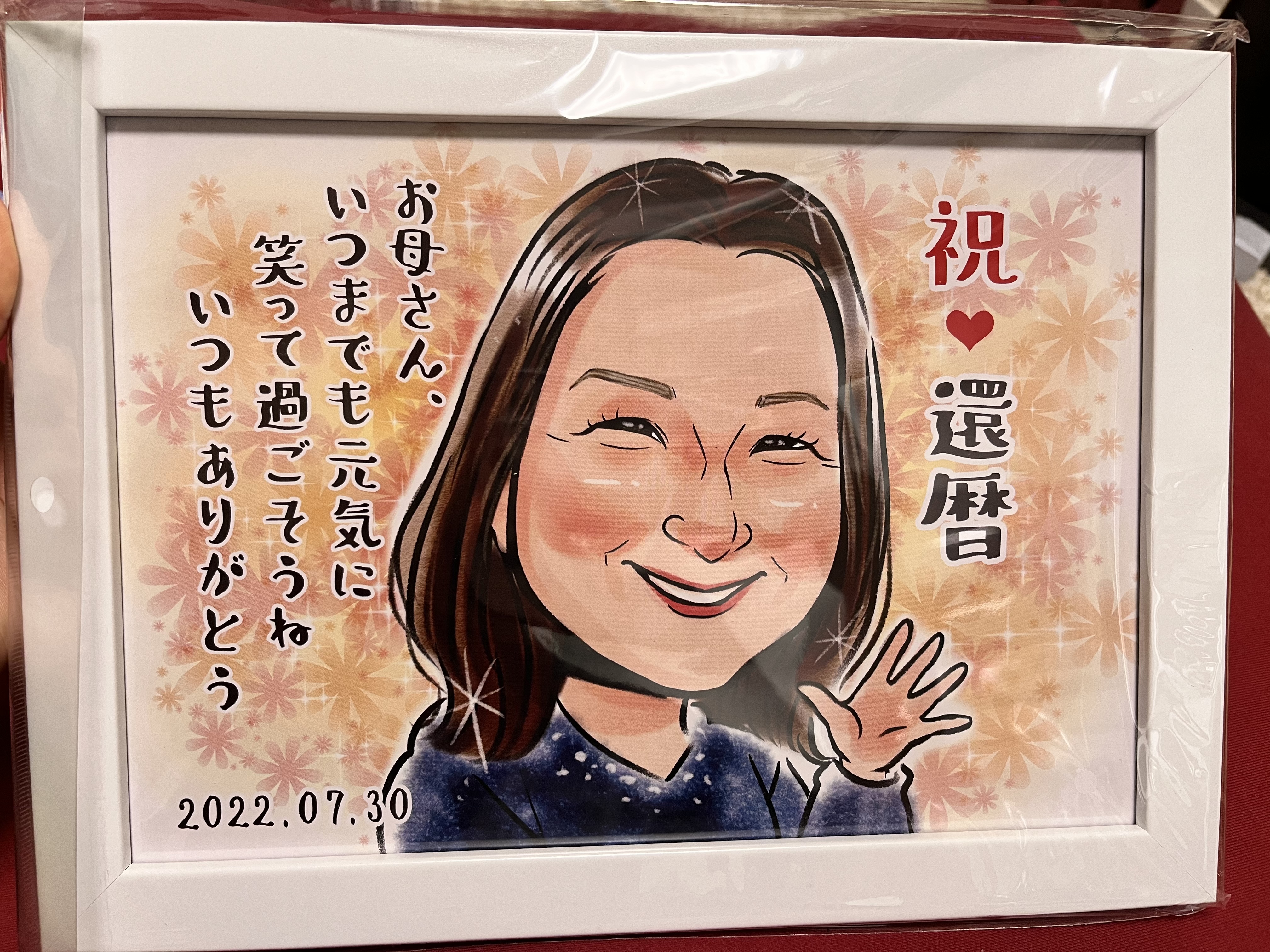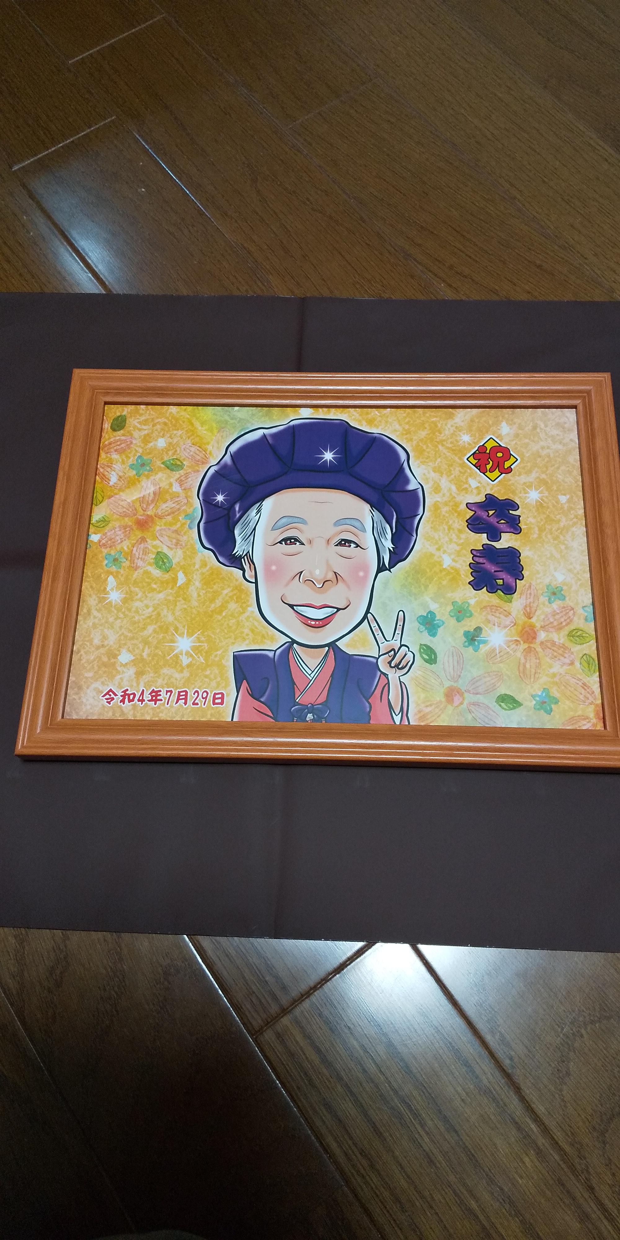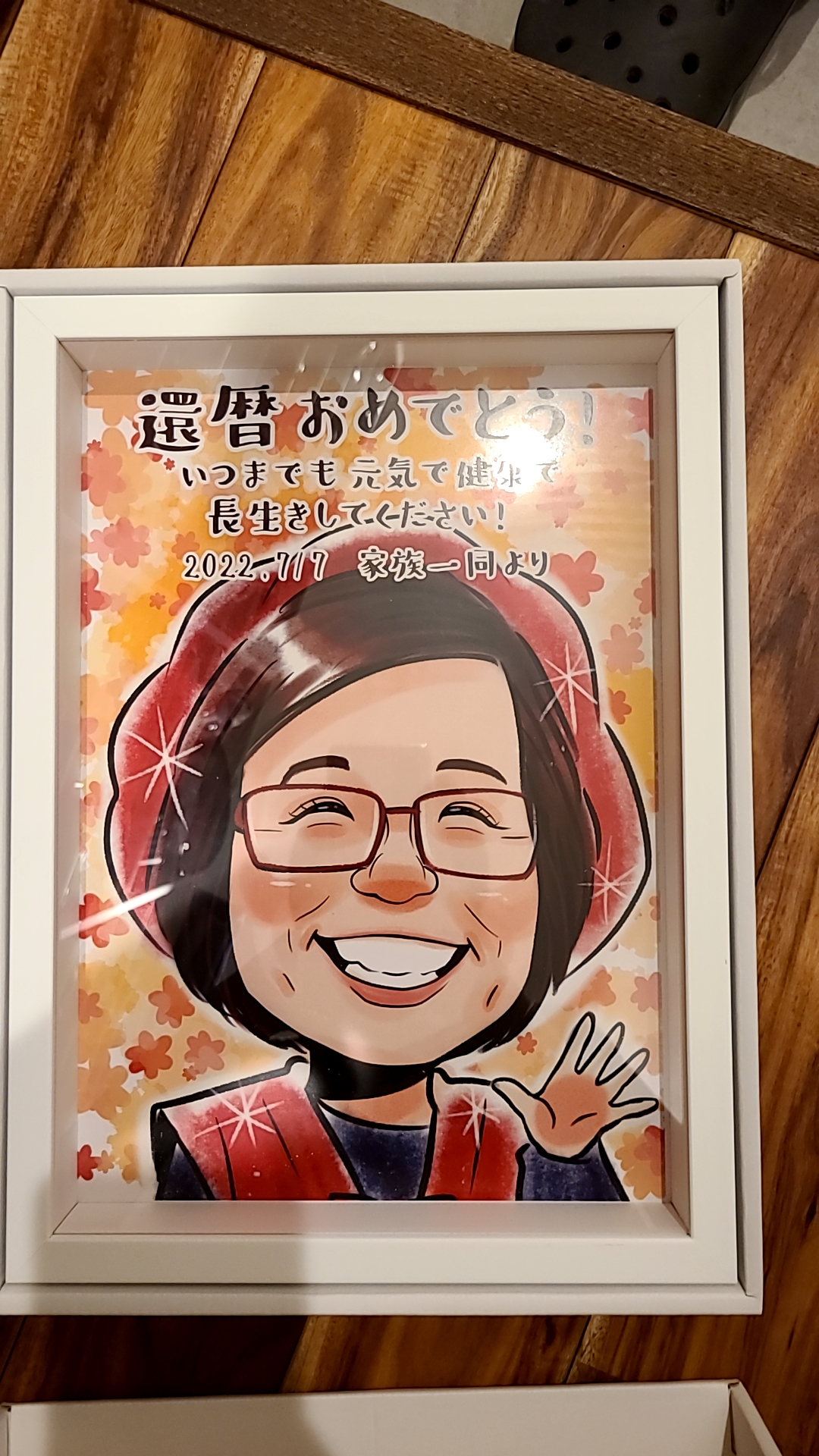 今回、コロナ禍の影響で約8年ぶりに親戚一同が集まるという事もあり、サプライズで子供・孫からのプレゼントとして発注させて頂きました。2家族分注文させて頂きましたが、とても鮮明な似顔絵で写真の特徴をしっかり捉えたクオリティーの高い似顔絵が手元に届きました。現代のカメラ・携帯カメラは鮮明な写りで顔の表情を映し出してくれますが、似顔絵の場合、蛍光色を使用することで写真には無い、色彩の表現を全面に映し出してくれるのでとても綺麗な作品だと感じました。お盆休みに渡すまで時間が待ち遠しいですが、似顔絵のフレーム(額縁)際に、子供・孫たちが写った写メを何枚か入れてみて、さらに似顔絵に花を咲かせてみようかと思います。ありがとうございました。
