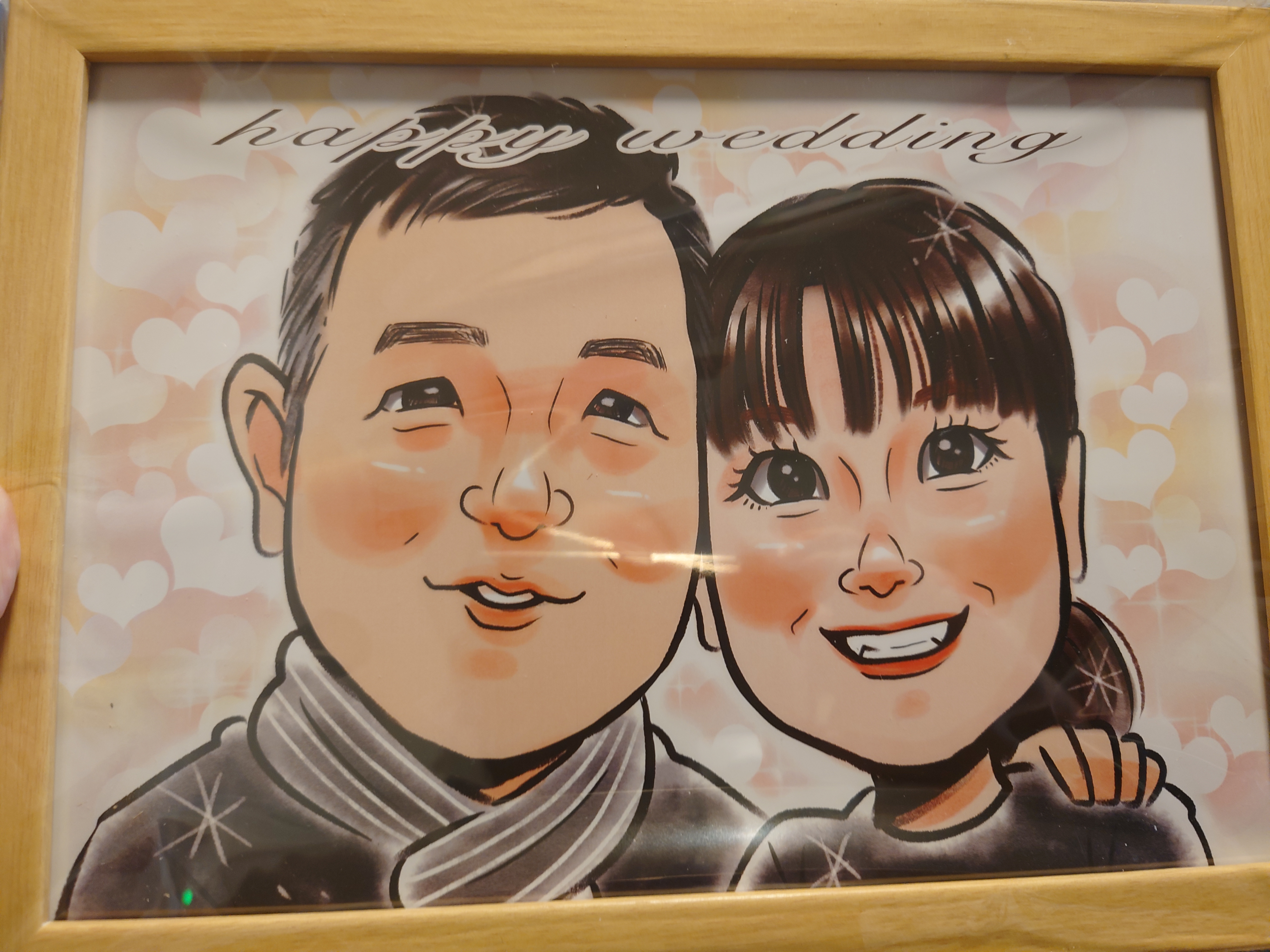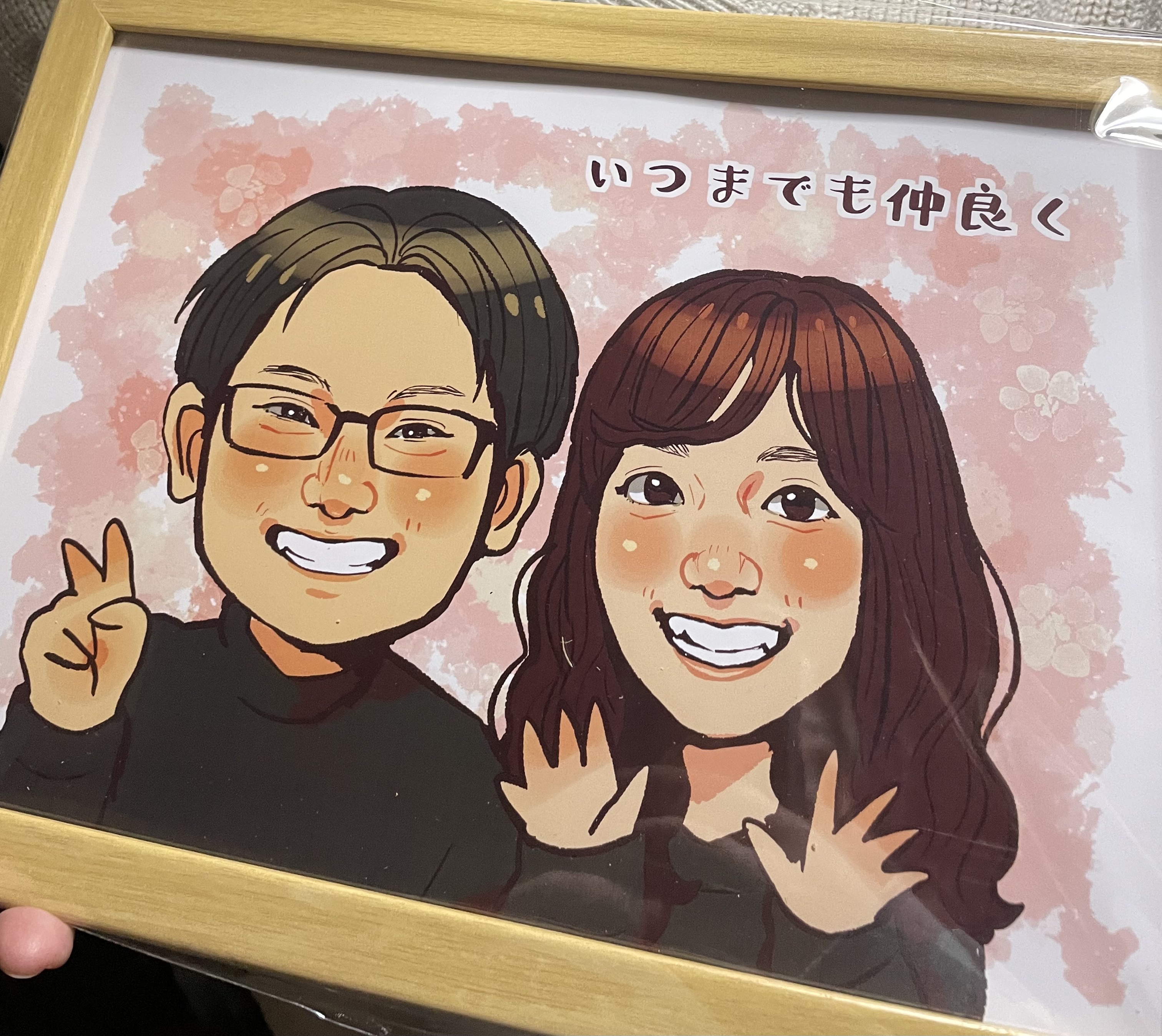 すごい似てた。とくに彼女さんに好評で、たいへん喜ばれました。二人で撮った写真がなかなかないそうなので、似顔絵でと思いお願いしましたが、贈ってよかったです。絵のタッチも優しく丁寧で、どんなものになるのか不安でしたが、今度は自分のもお願いしようかと思っています。いい贈り物ができました。ありがとうございます。