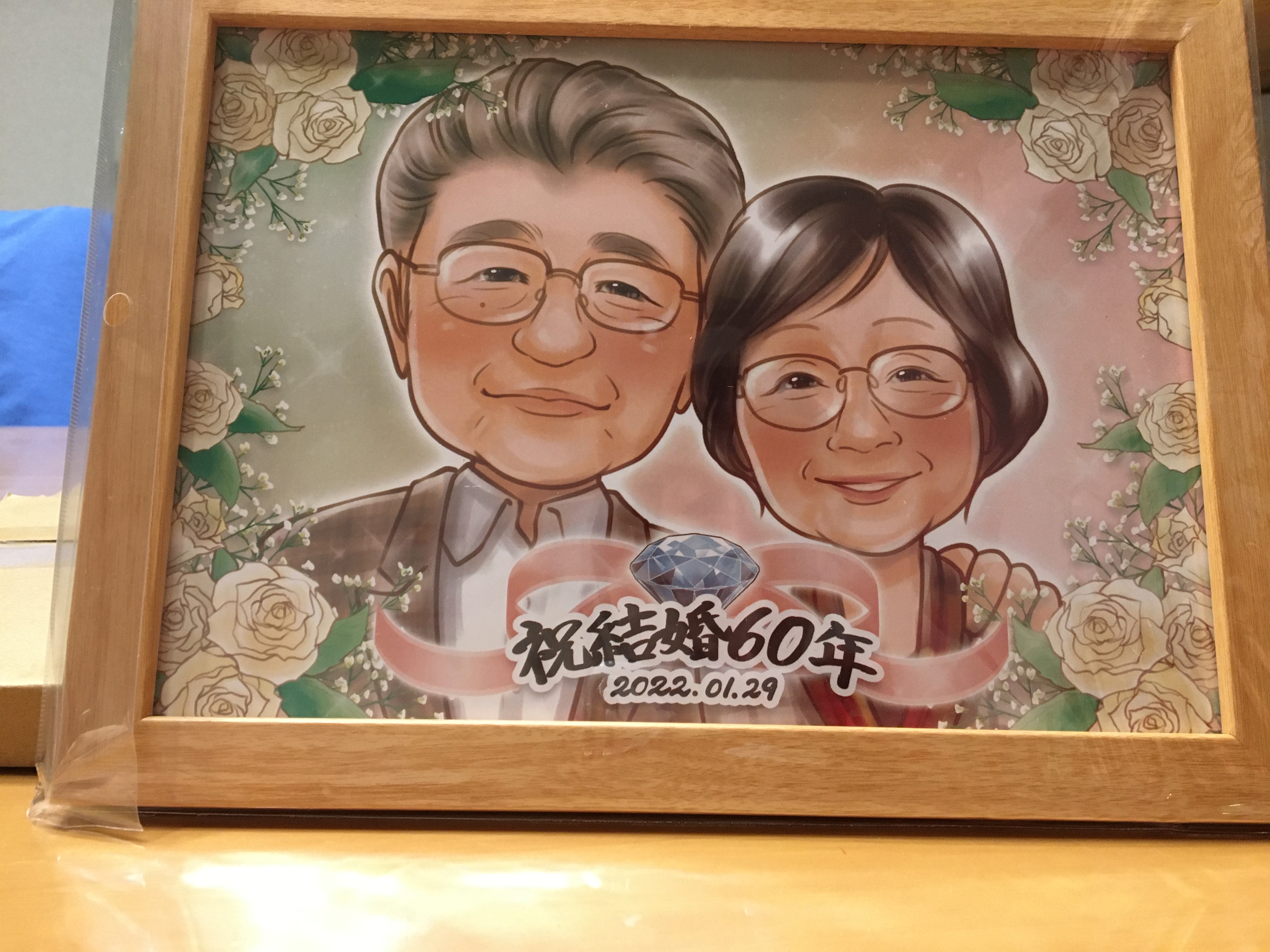 素敵な絵をありがとうございました。両親の結婚60年のお祝いに初めて依頼しました。何枚か写真を添付し、どんな風に描いていただけるのか届くのをドキドキして待っていました。箱を開けて想像以上の仕上がりで感激しました。優しい雰囲気に仕上げていただき感謝しています。 両親に渡す日が楽しみです。本当にありがとうございました。