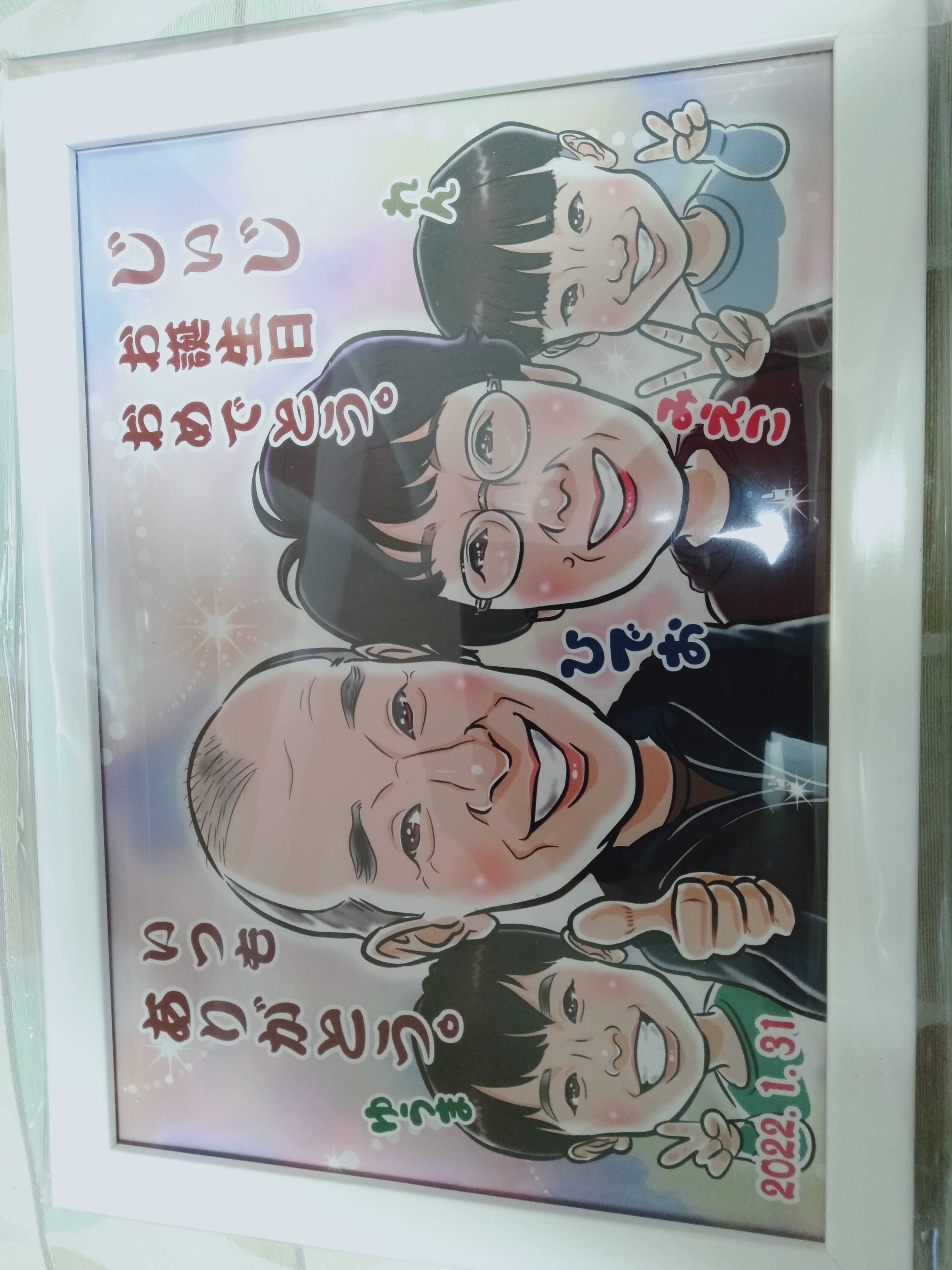 本当に早い発送でした!!日曜注文、金曜には手元に、土曜の米寿祝い当日に手渡すことができました!!暖かいタッチで描かれており、とても可愛らしかったです!祖父も喜んでおりました! 初めてイラストのプレゼントをしましたが、渡す方も貰う方も心がほんわりするので、イラストプレゼントいいものですね!これから活用しようと思いました!!