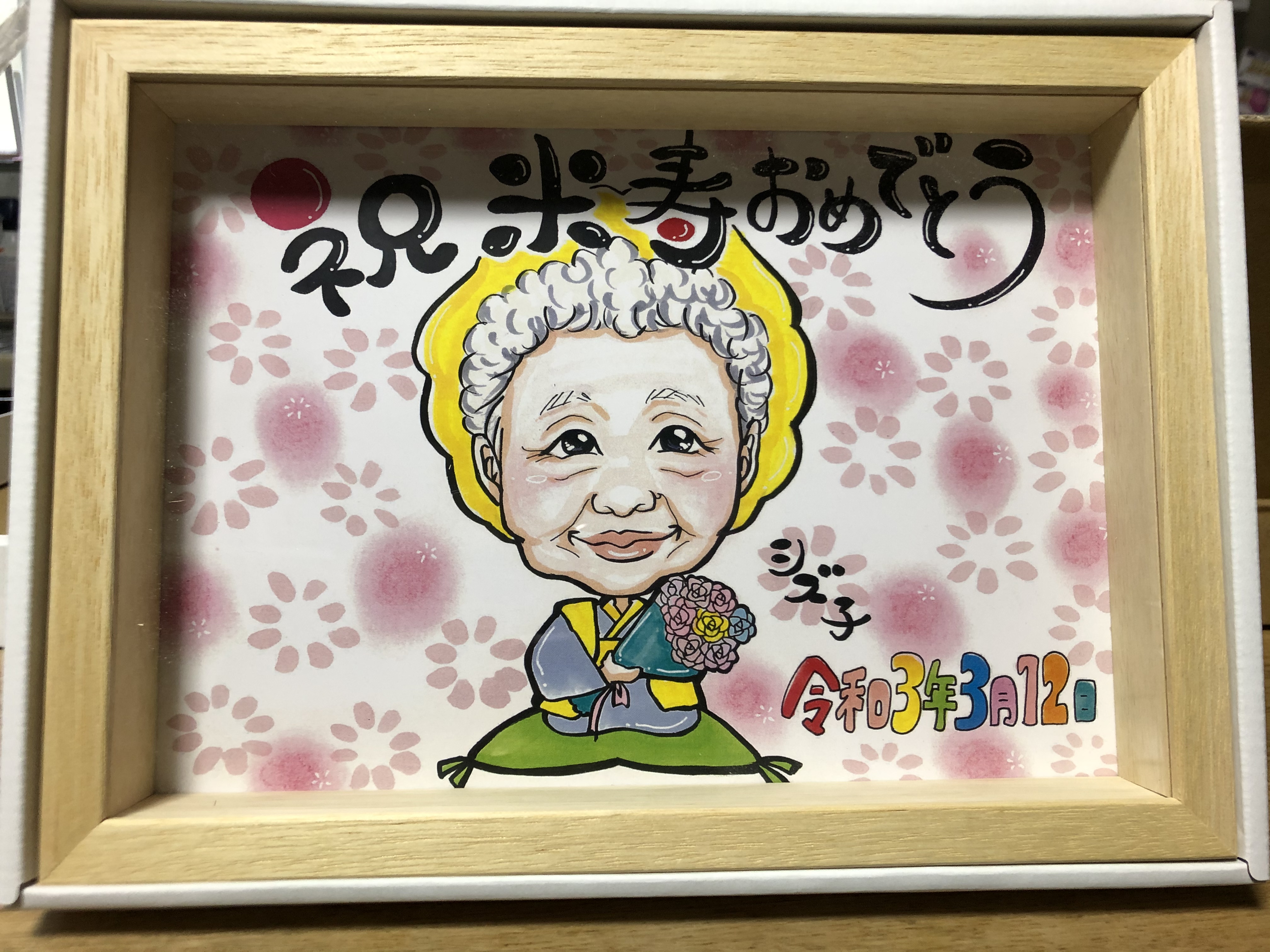 米寿祝いで ちゃんちゃんこ姿や花束を手に持って とか いろいろ注文させてもらいましたが、思ってた以上に可愛く 本人よりべっぴんさんに仕上げていただき(笑) 本人も大変喜んでくれて 良い記念品になりました。 前回は 義父の米寿祝いにと どんなプレゼントがいいか悩んだ末 似顔絵は… と思い浮かび 利用させてもらい 家族も高評価でしたので 今回の義母のプレゼントは 絶対に と思っていました。 ありがとうございました